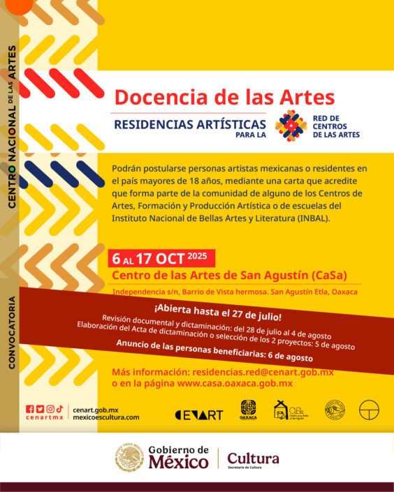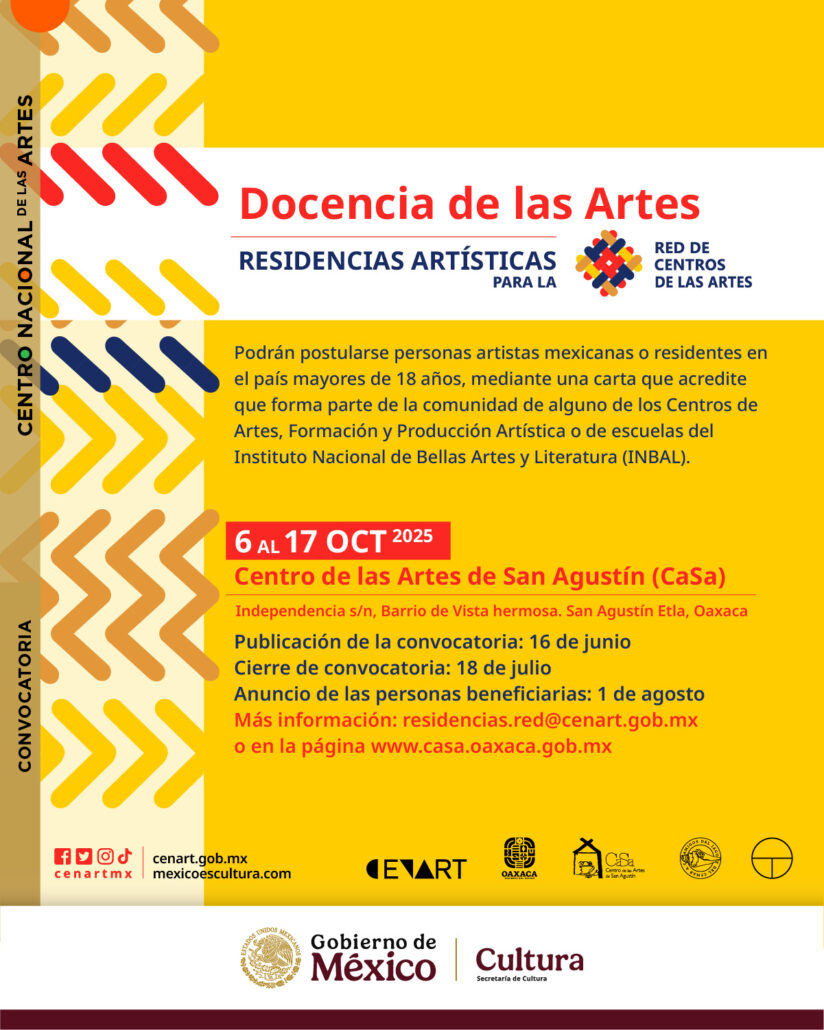 Más información a través del correo residencias.red@cenart.gob.mx o consultar la página casa.oaxaca.gob.mx