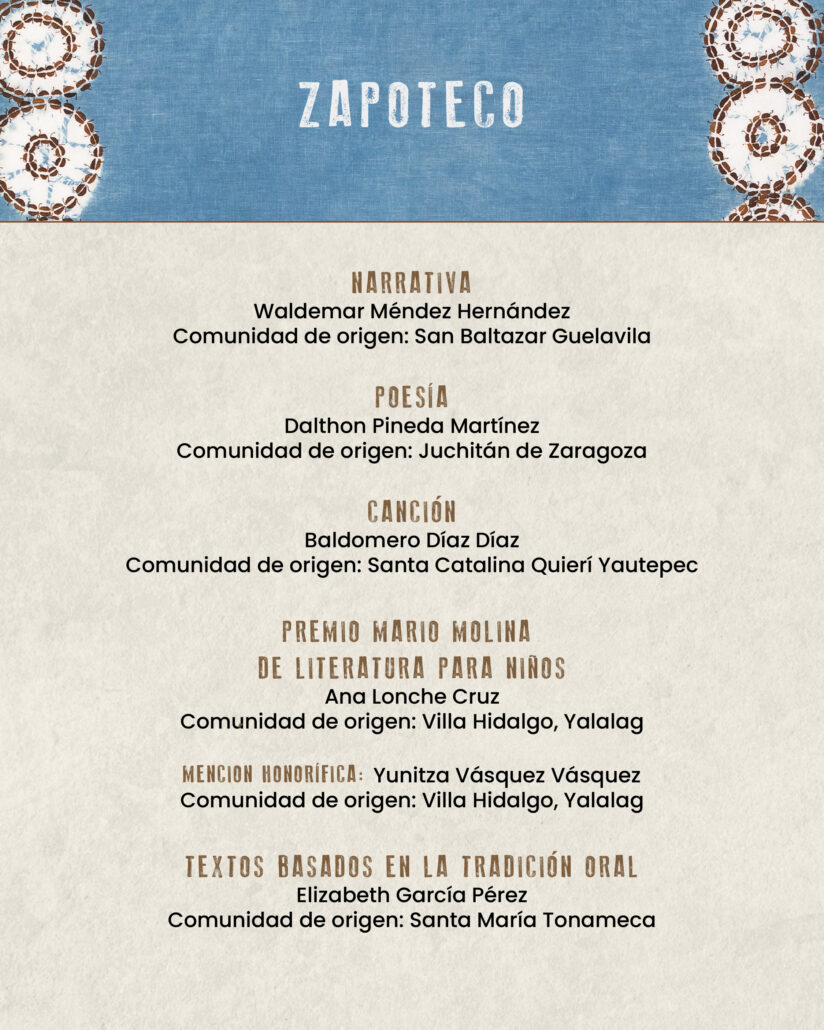 4. La obra, de extensión libre, deberá ser escrita en zapoteco, en cualquiera de sus variantes, e incluir una traducción al español.