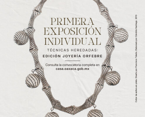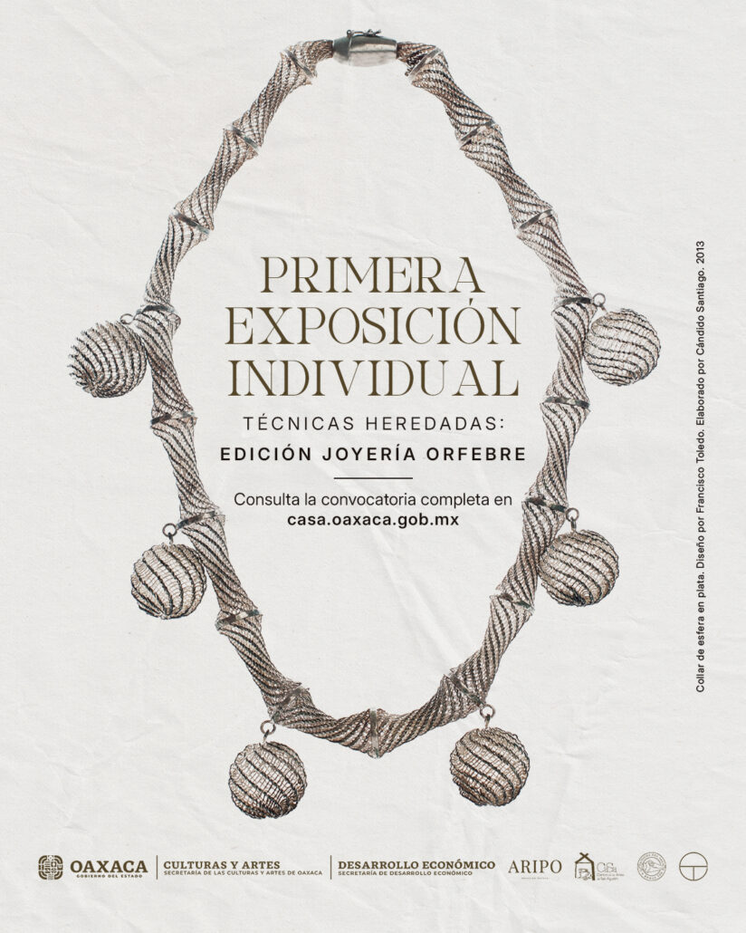 La Asociación Civil Amigos del Instituto de Artes Gráficas de Oaxaca y del Centro Fotográfico Manuel Álvarez Bravo, junto con el Centro de las Artes de San Agustín, el Instituto de Artes Gráficas de Oaxaca, la Secretaría de Desarrollo Económico de Oaxaca, la Comercializadora de Productos Oaxaqueños (Tienda ARIPO) y la Secretaría de las Culturas y Artes de Oaxaca convoca a las y los oaxaqueños que hayan demostrado una habilidad excepcional en la producción de piezas de joyería orfebre mediante técnicas heredadas, a participar en la convocatoria Primera Exposición Individual con el objetivo de reconocer y promover su trabajo a través de una exhibición en el interior del Chalet del CaSa.